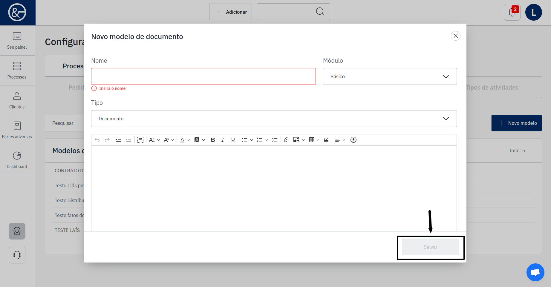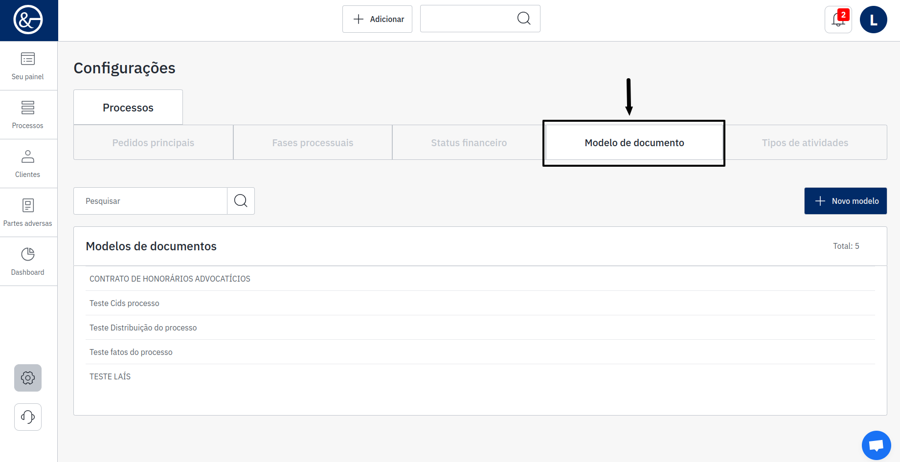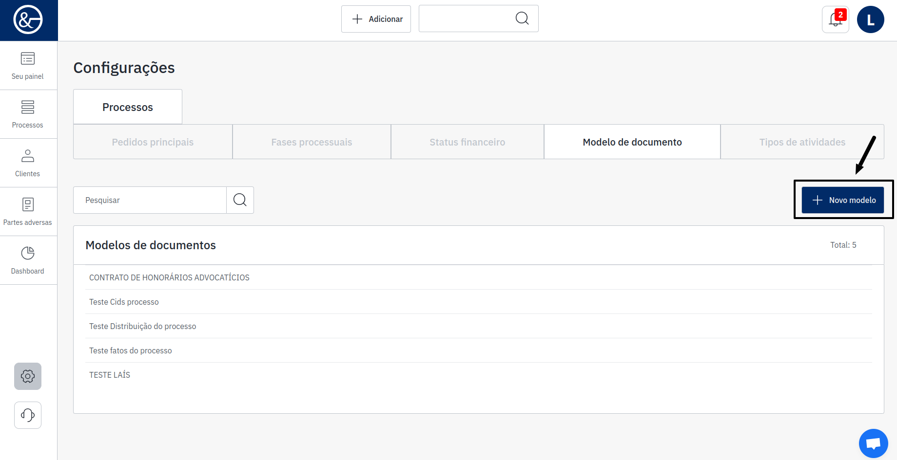 No canto superior direito da tela, há um campo com a opção + Novo Modelo, onde será necessário clicar, informar o nome, módulo e tipo.