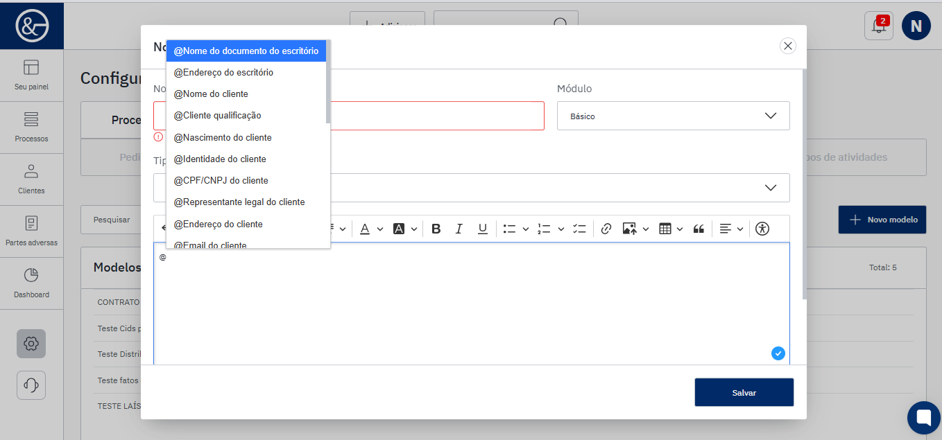 Abaixo, há uma caixa de texto onde você pode digitar livremente ou, se tiver um modelo pronto, basta copiar e colar. Nesse campo, ao digitar "@" aparecerão algumas informações que permitem o sistema buscar dados automaticamente ao carregar esse modelo, evitando a necessidade de digitar as mesmas informações repetidamente.