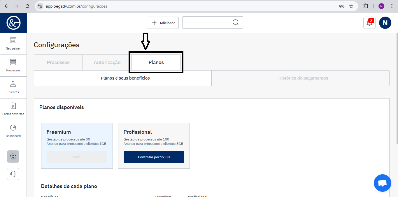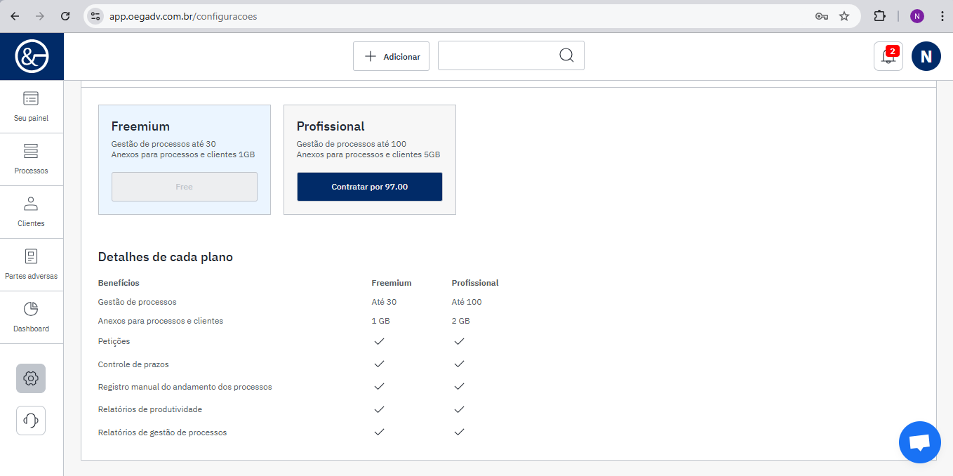 No OEGadv, atualmente, existem dois planos disponíveis: Freemium e Profissional. O plano Freemium permite o uso gratuito do sistema para gestão de até 30 anexos para processos e clientes, com um limite de 1GB. Ao ultrapassar esse limite, será necessário migrar para o plano Profissional, que oferece gestão de até 100 anexos e 5GB de armazenamento. A seguir, explico como realizar a modificação de plano.