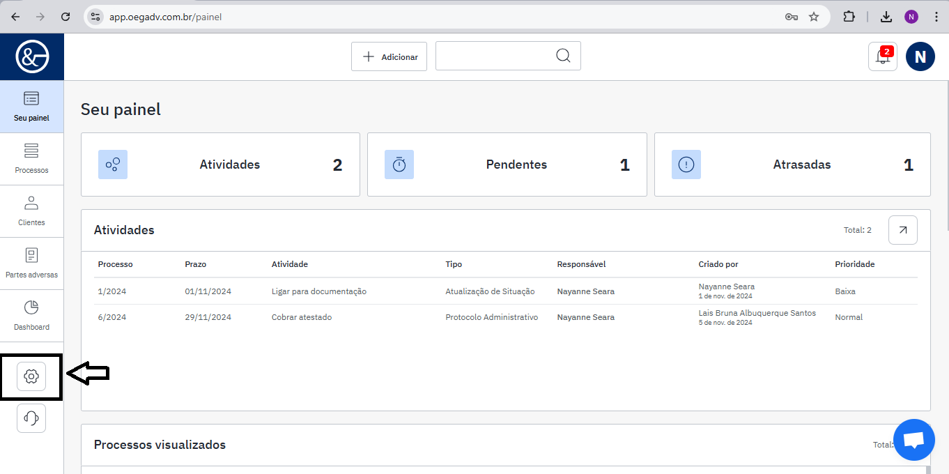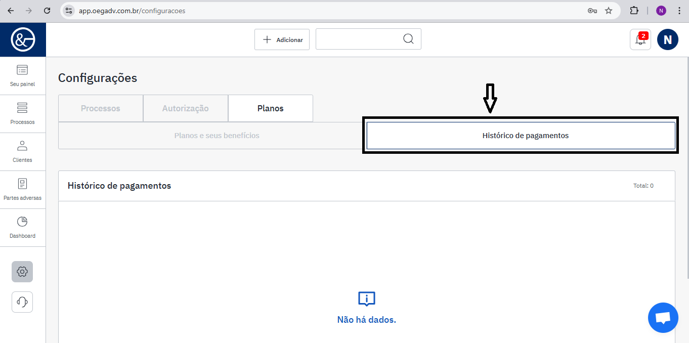 Na tela inicial do OEGadv, no canto inferior esquerdo, clique em "configuração". Você será redirecionado para a página de configurações, onde poderá realizar a modificação do seu plano no sistema.