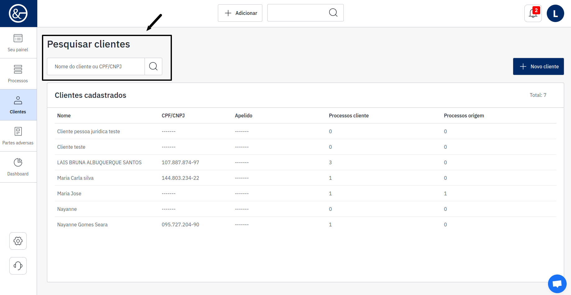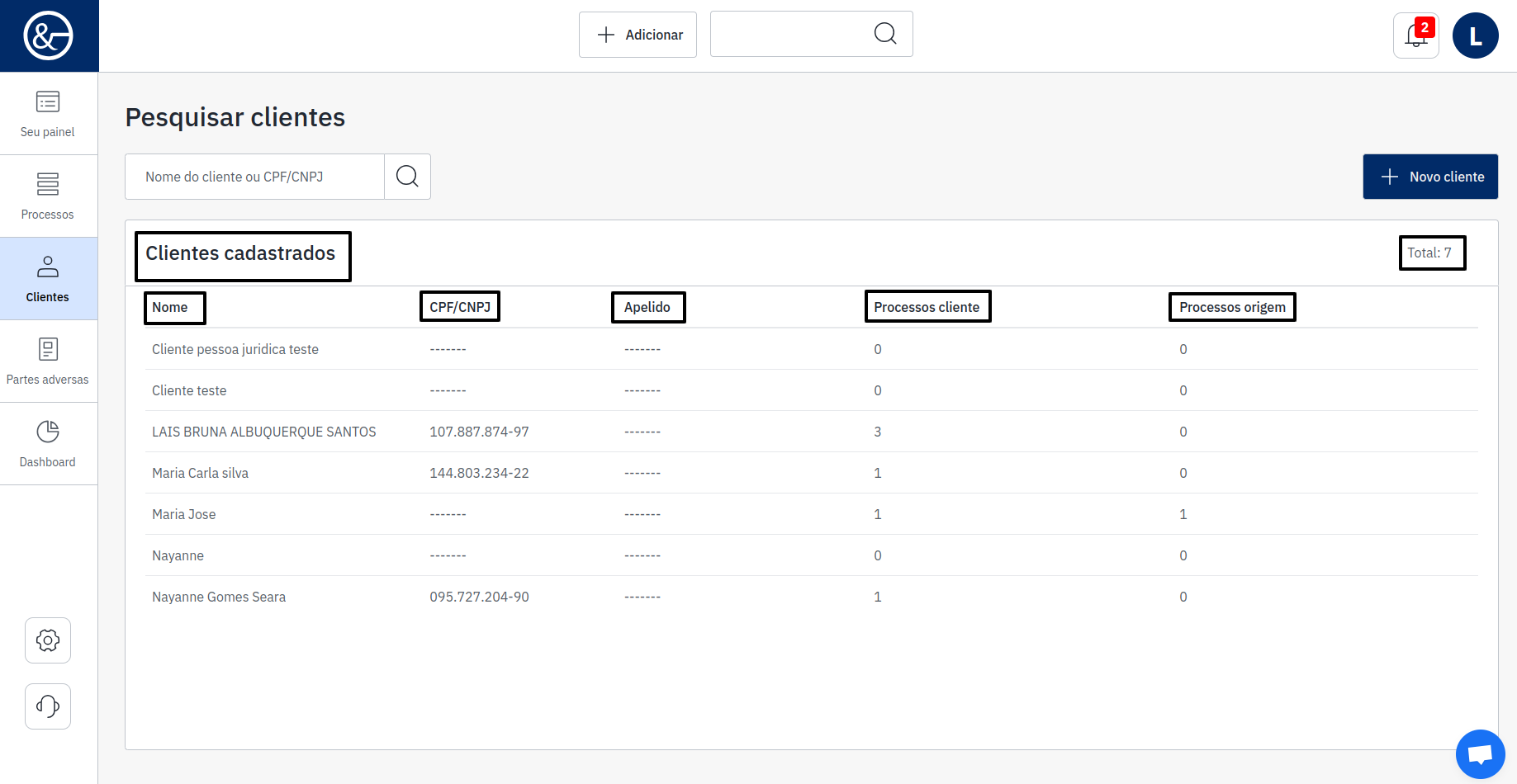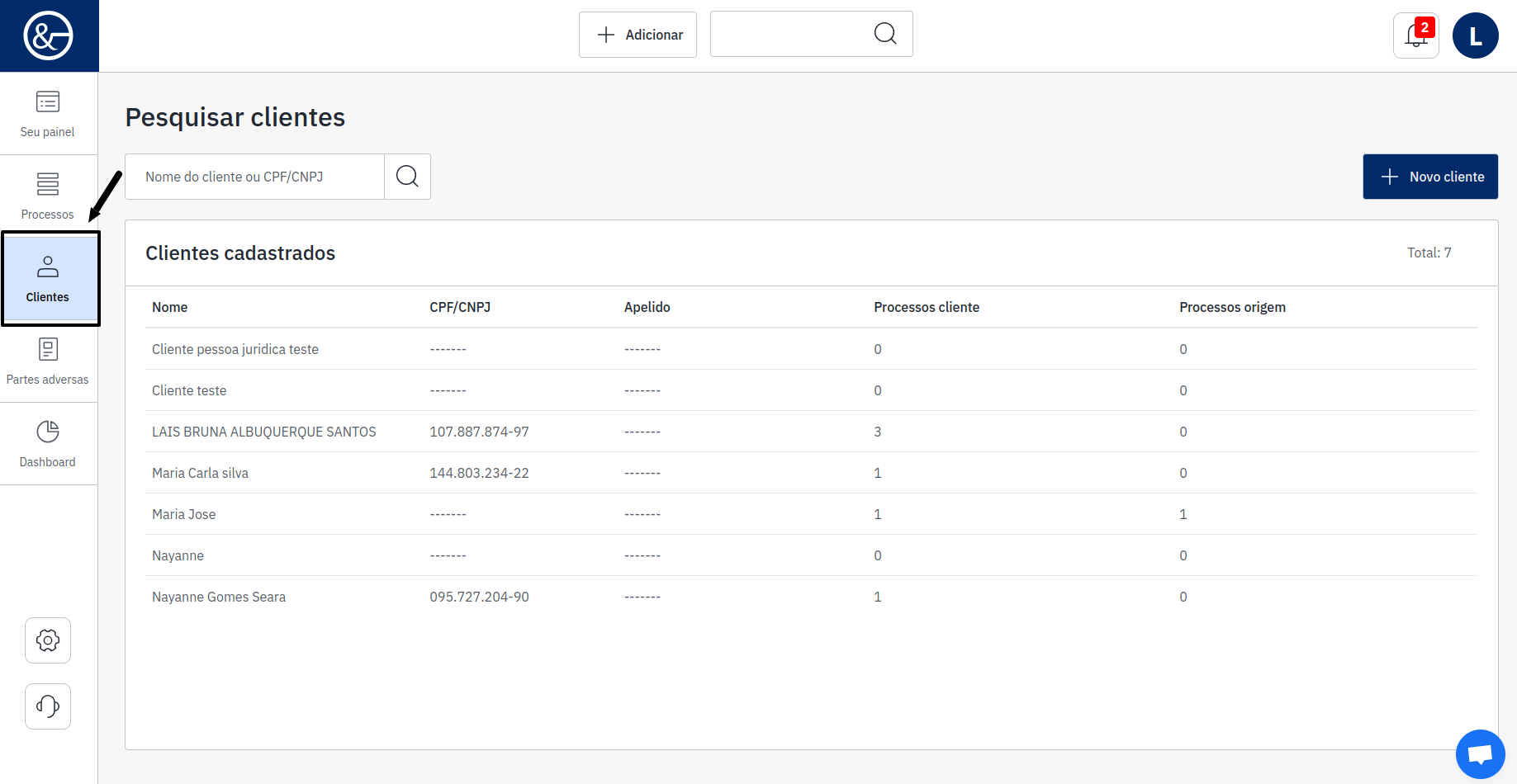 Abaixo, serão exibidos todos os clientes cadastrados, com a informação da quantidade de registros, incluindo nome, CPF/CNPJ, apelido, a quantidade de processos desse cliente e a quantidade de processos da origem.