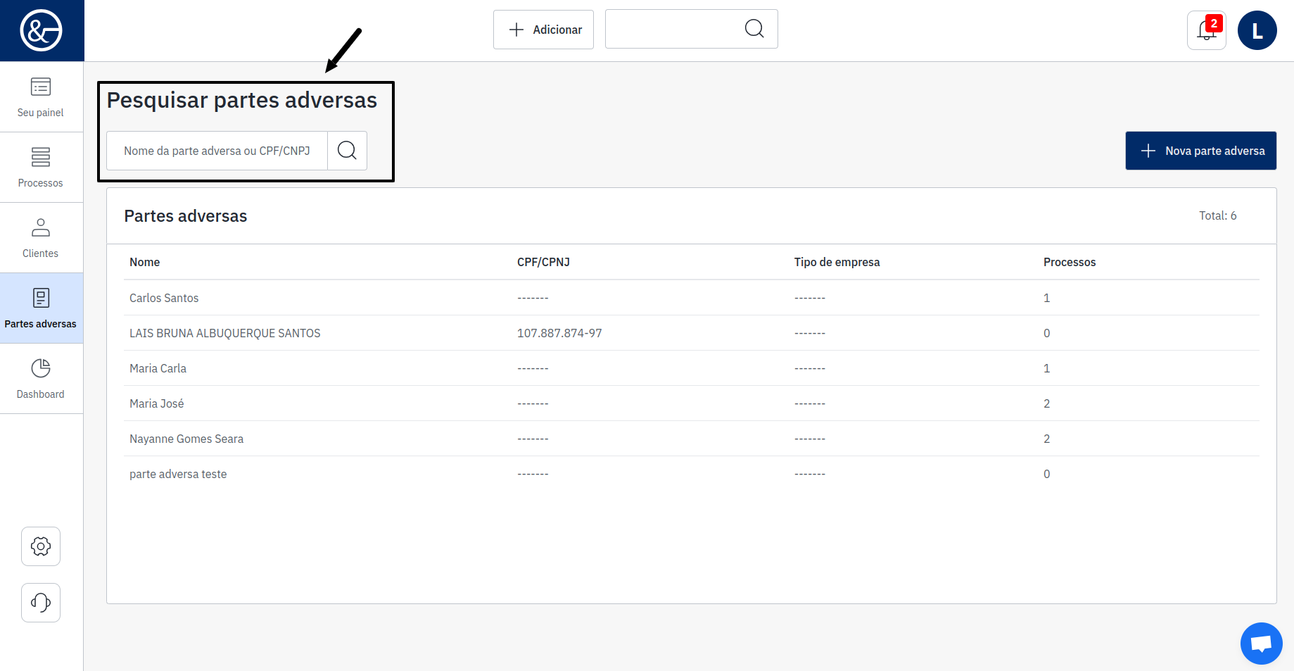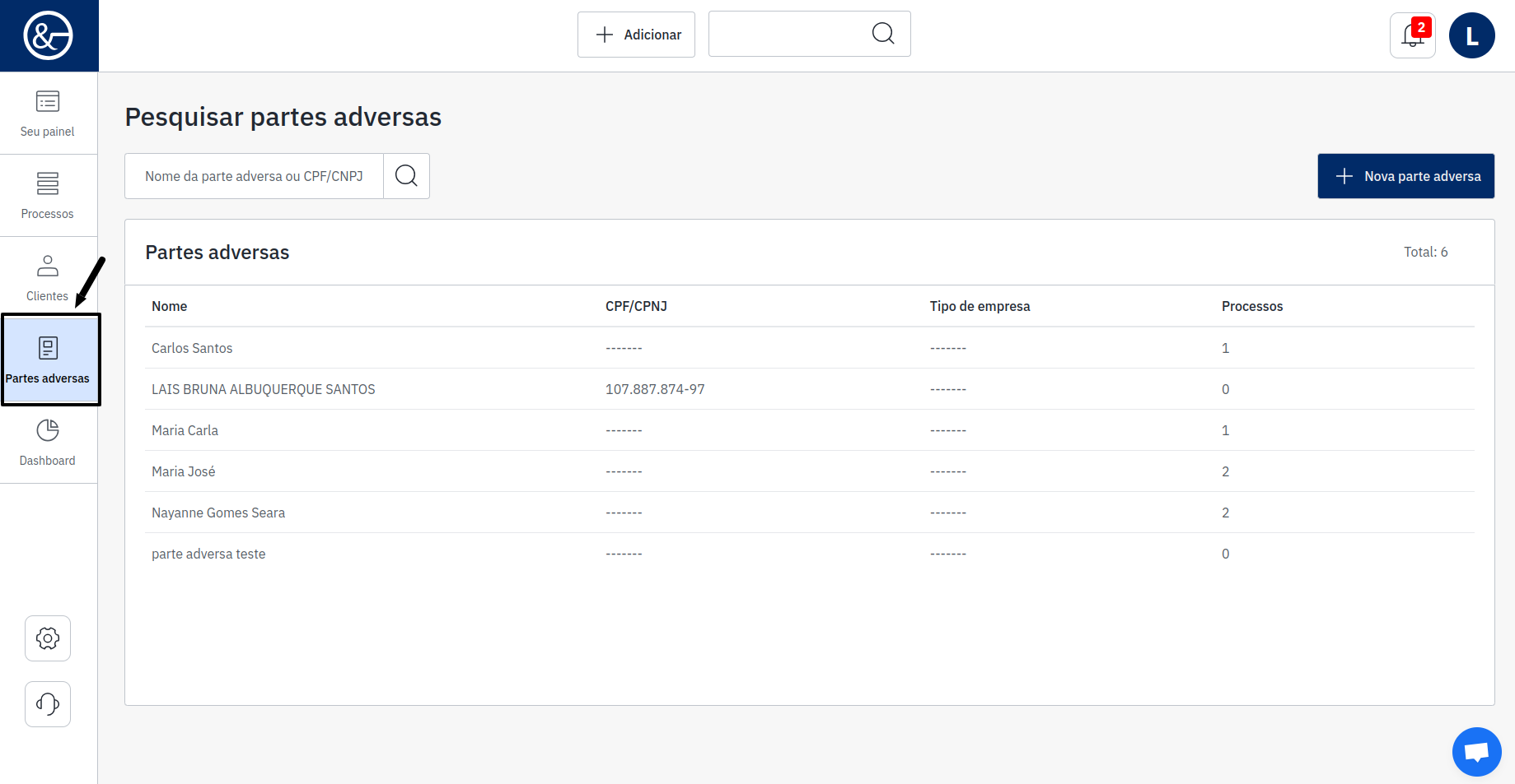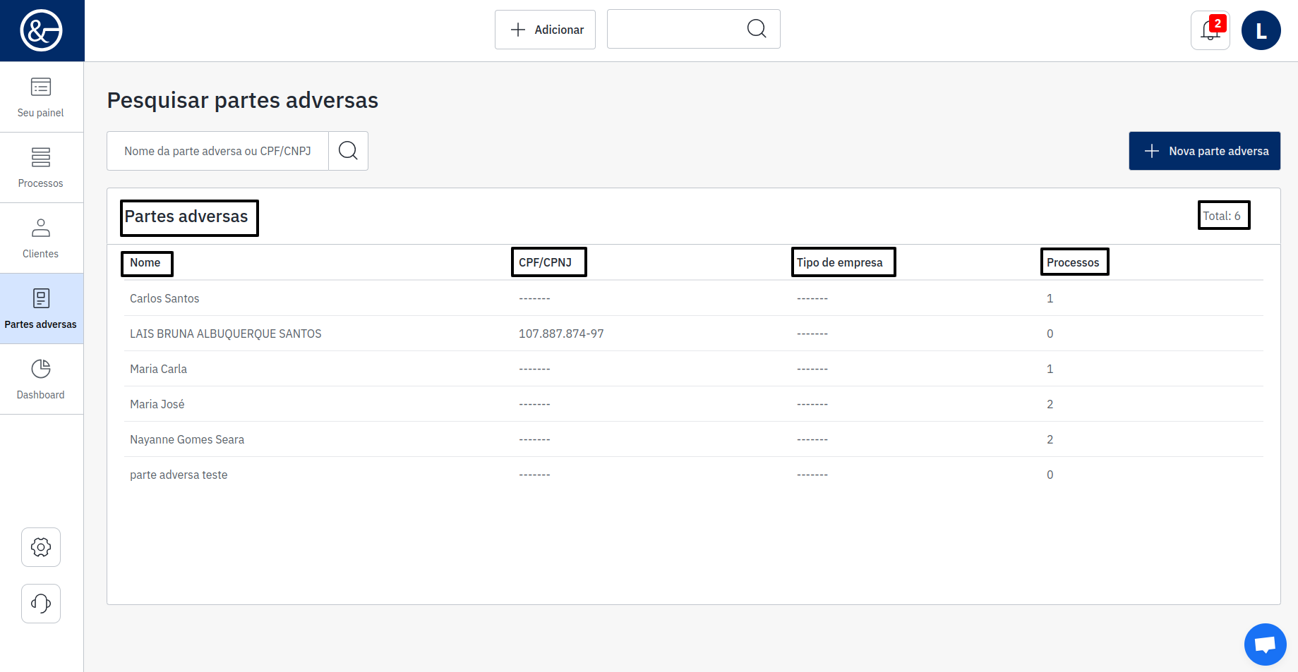 Abaixo, serão exibidos os nomes das partes adversas cadastradas, com informações de CPF/CNPJ, tipo de empresa e a quantidade de processos.