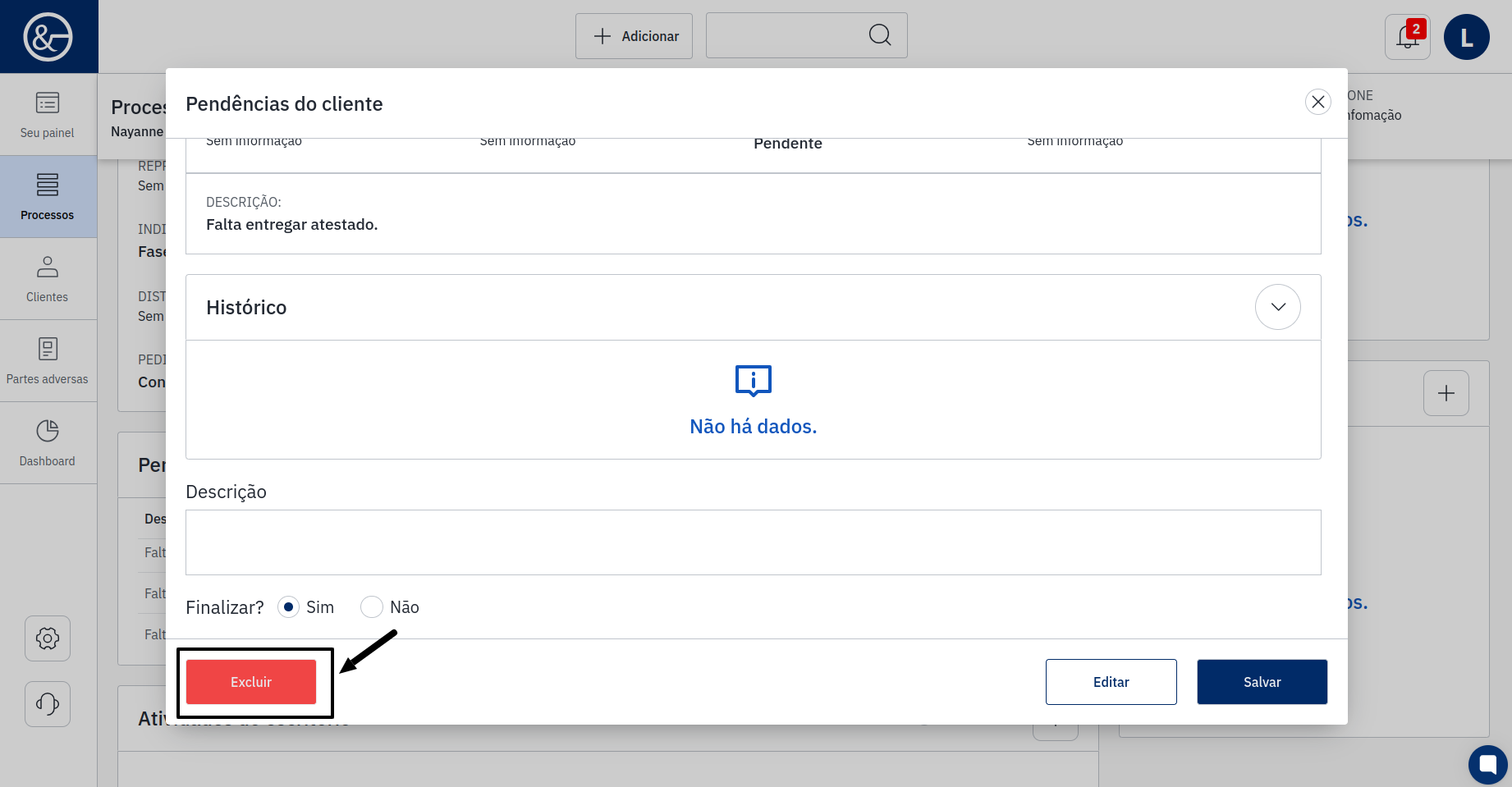 Caso deseje excluir a pendência, será necessário clicar no nome do cliente. O sistema abrirá uma tela, e no campo inferior esquerdo, terá a opção de excluir.
