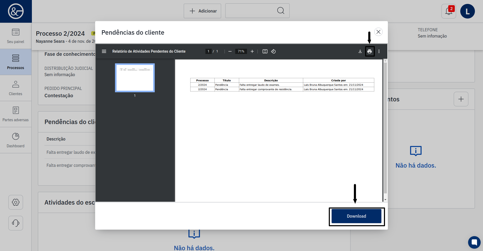 Após clicar no ícone PDF, o relatório será disponibilizado com as informações do número do processo, título, descrição e os dados de quem criou a pendência, incluindo o nome da pessoa e a data, sendo possível imprimir ou realizar o download.