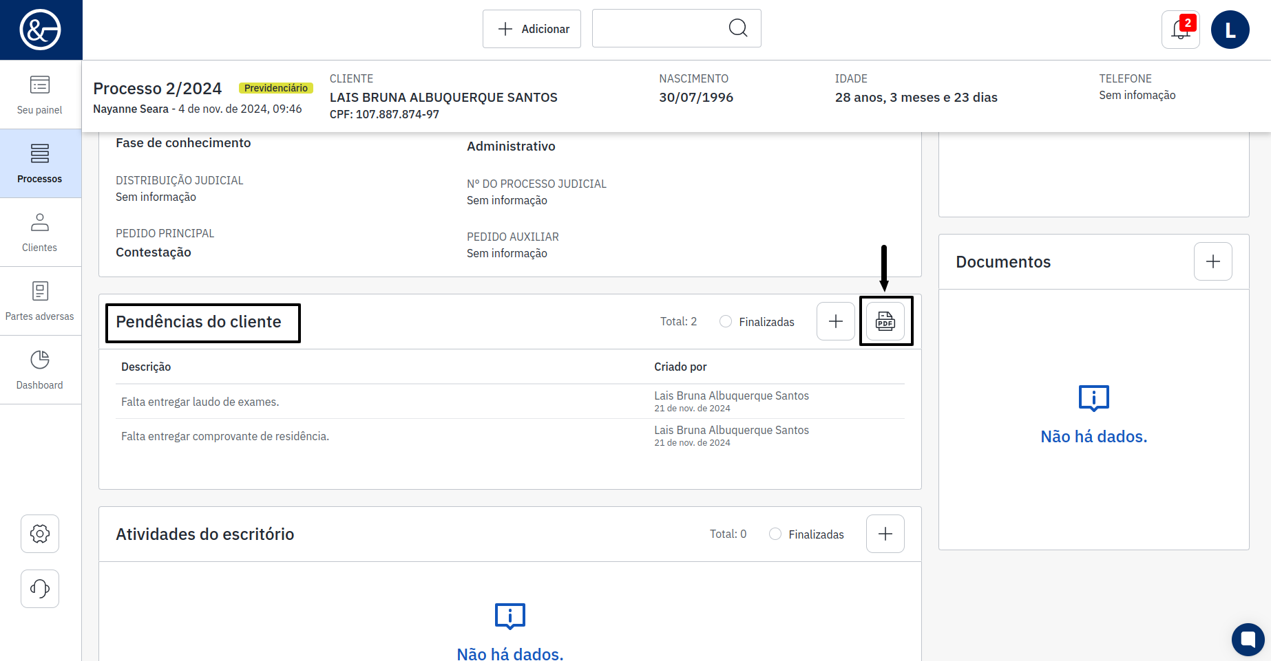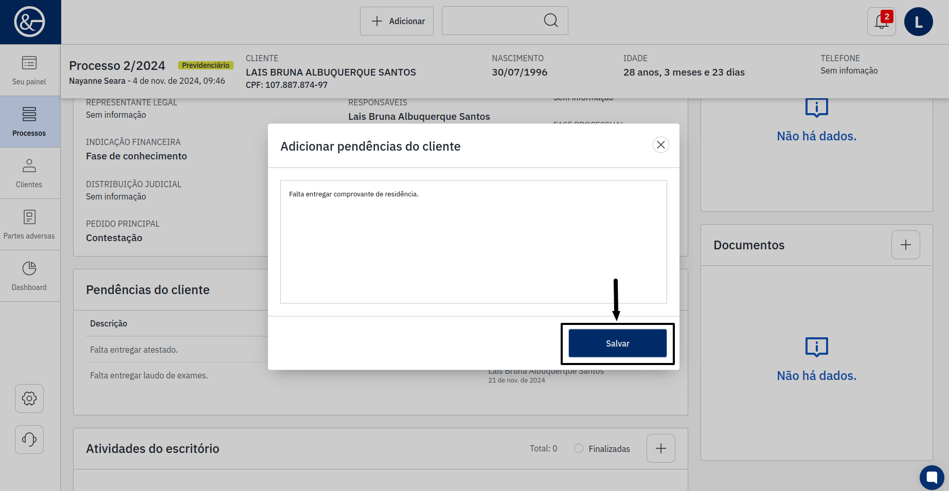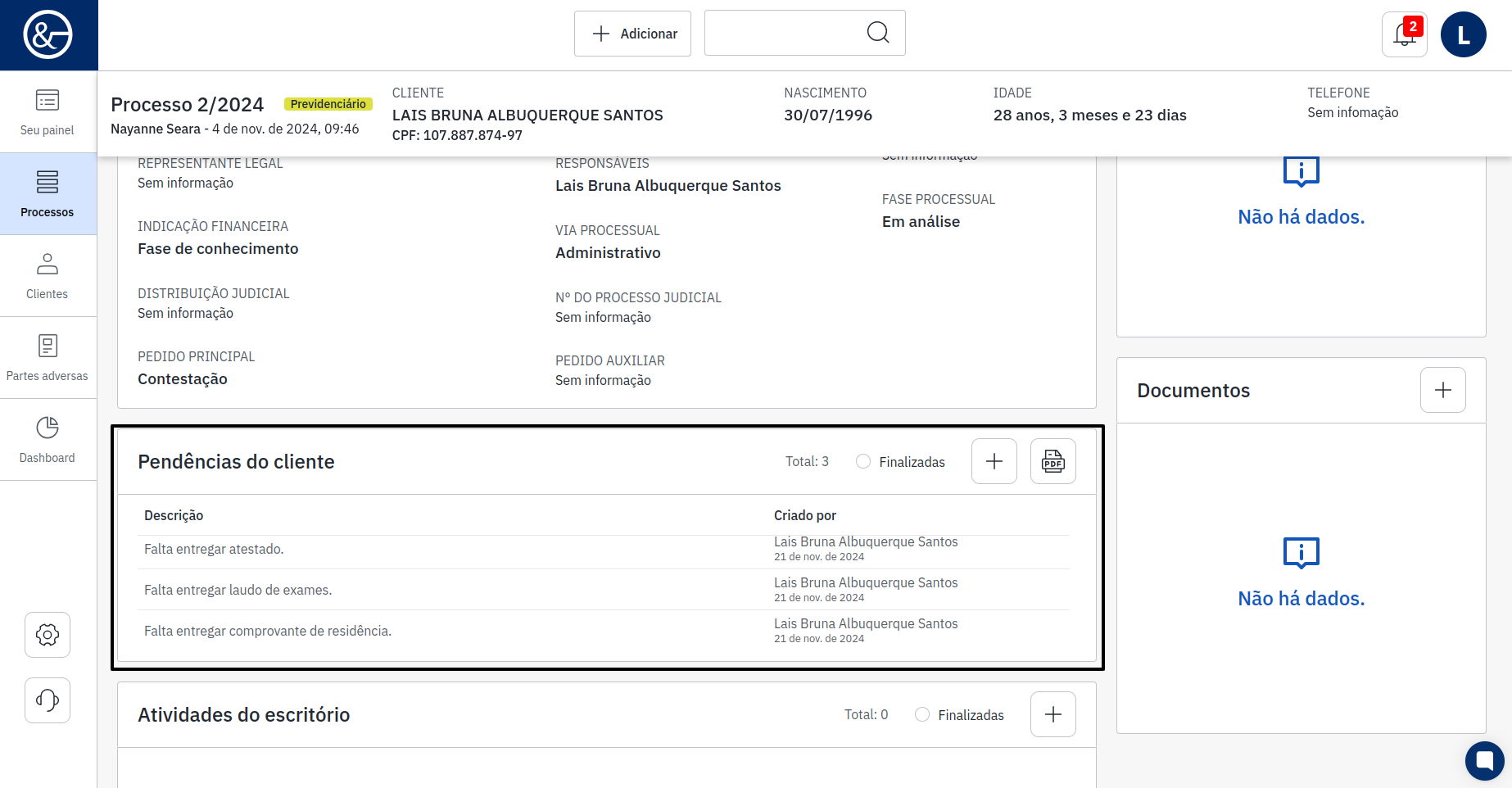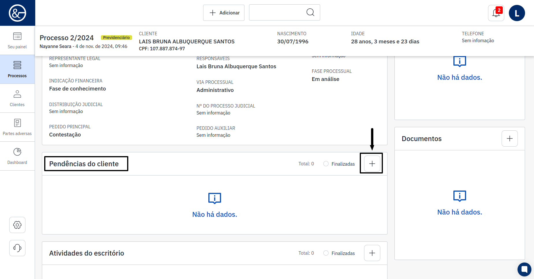 Após clicar no nome, as informações do processo do cliente serão exibidas. No campo central, na parte inferior do sistema, onde está "Pendências do Cliente", há um ícone de "+". Será necessário clicar nesse ícone para adicionar a informação.