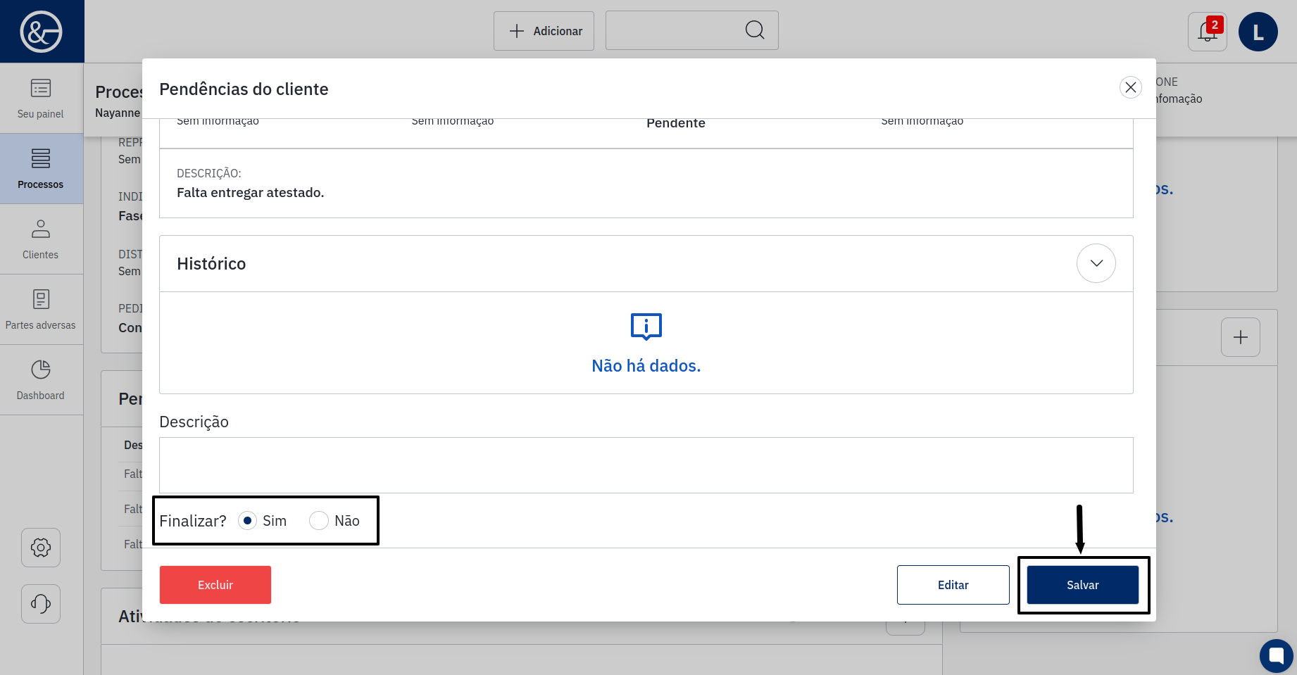 Para finalizar a "pendência", basta clicar na atividade que deseja concluir. O sistema abrirá uma tela com as informações das pendências, onde você poderá adicionar a descrição e informar se a pendência foi finalizada, para então salvar.