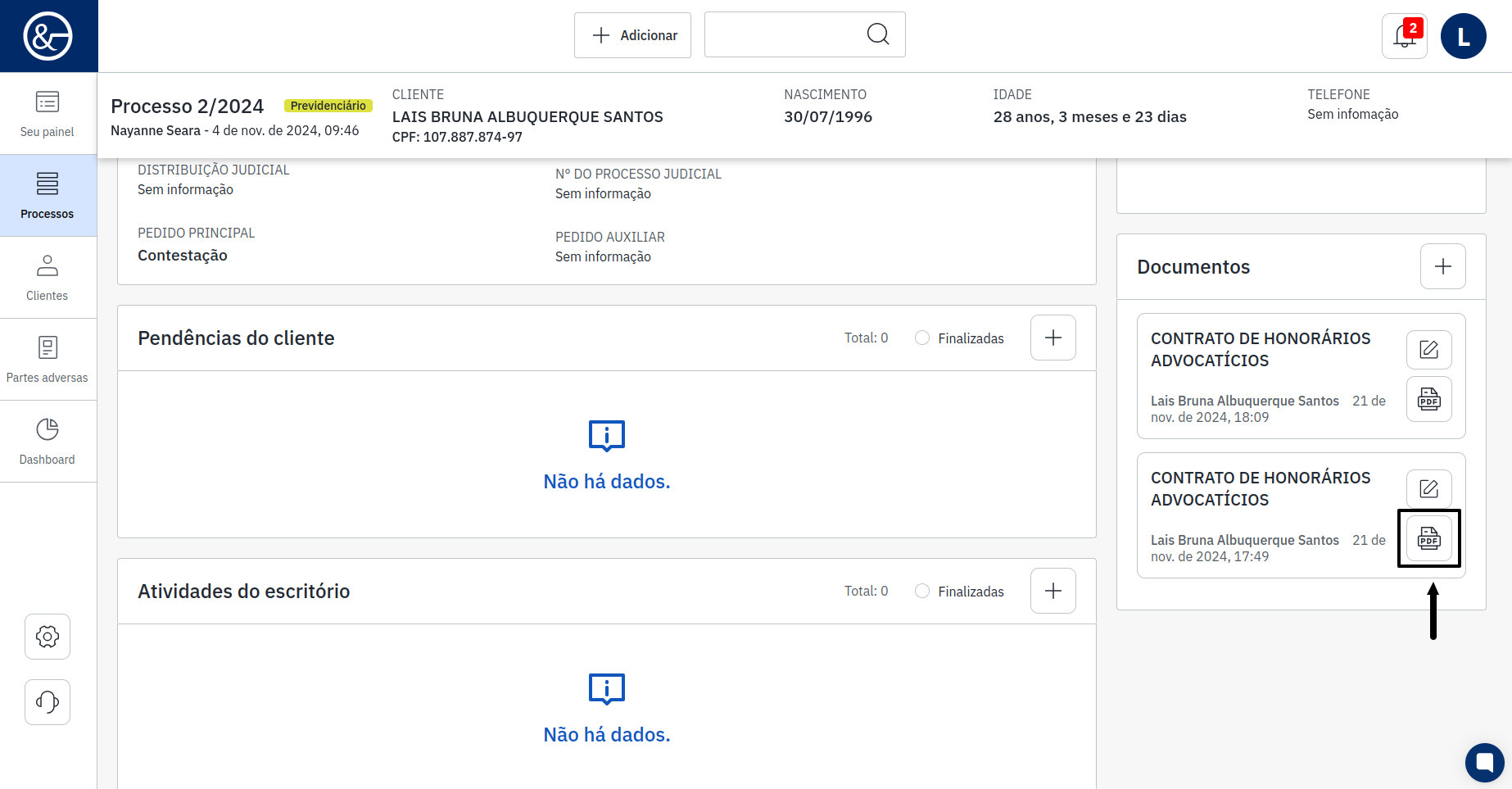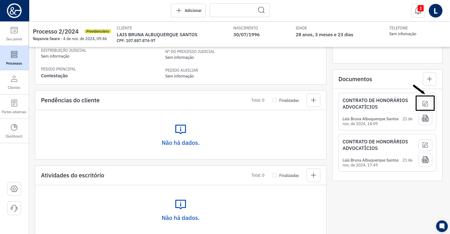 Após salvar, o sistema exibirá as informações dos documentos na ordem em que foram criados, como o nome de quem criou, data e horário. Caso queira editar o documento, é necessário clicar no ícone de lápis ao lado do nome do cliente.