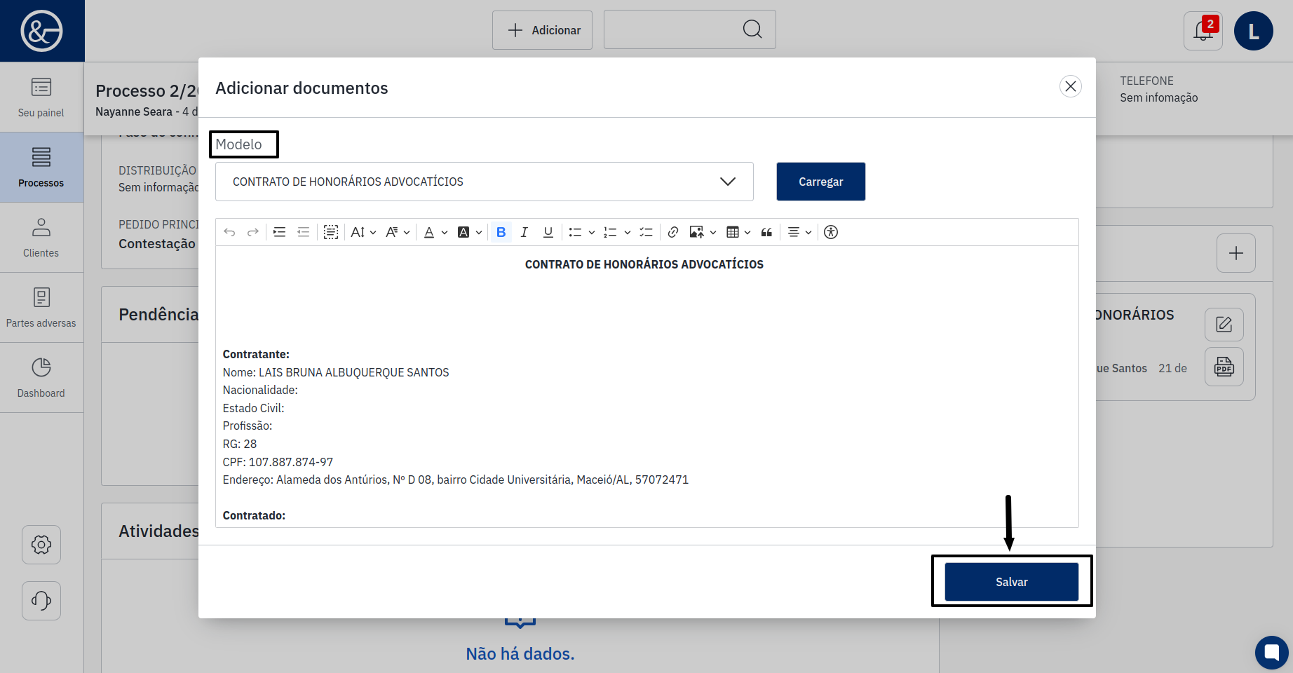 Após clicar no nome, as informações do processo do cliente serão exibidas. No canto inferior direito, há um campo chamado "Documentos", com um ícone de "+", onde é necessário clicar para adicionar o documento.
