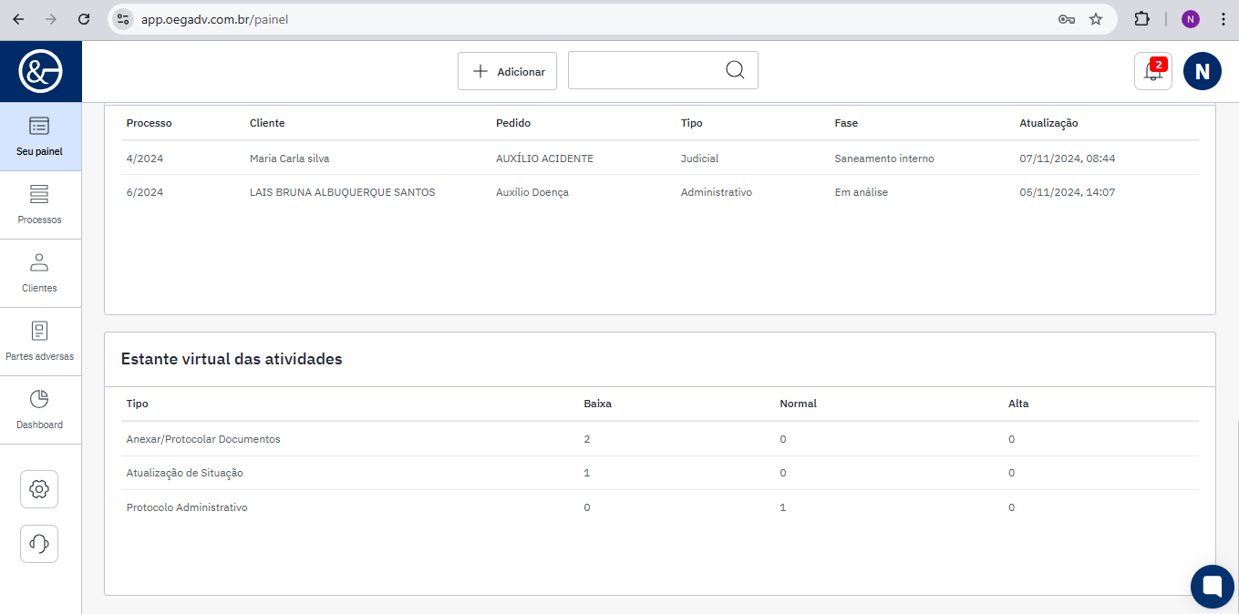 Em seu painel, é possível visualizar as atividades, incluindo as pendentes e atrasadas. Clique no nome da atividade para acessá-las, e, ao selecionar uma atividade, o processo relacionado será automaticamente aberto.
