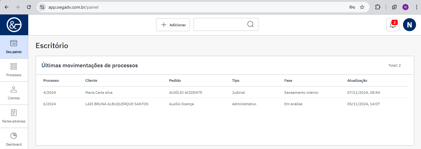 No escritório, é possível visualizar as últimas movimentações dos processos, com as informações de data e hora de cada movimentação realizada.