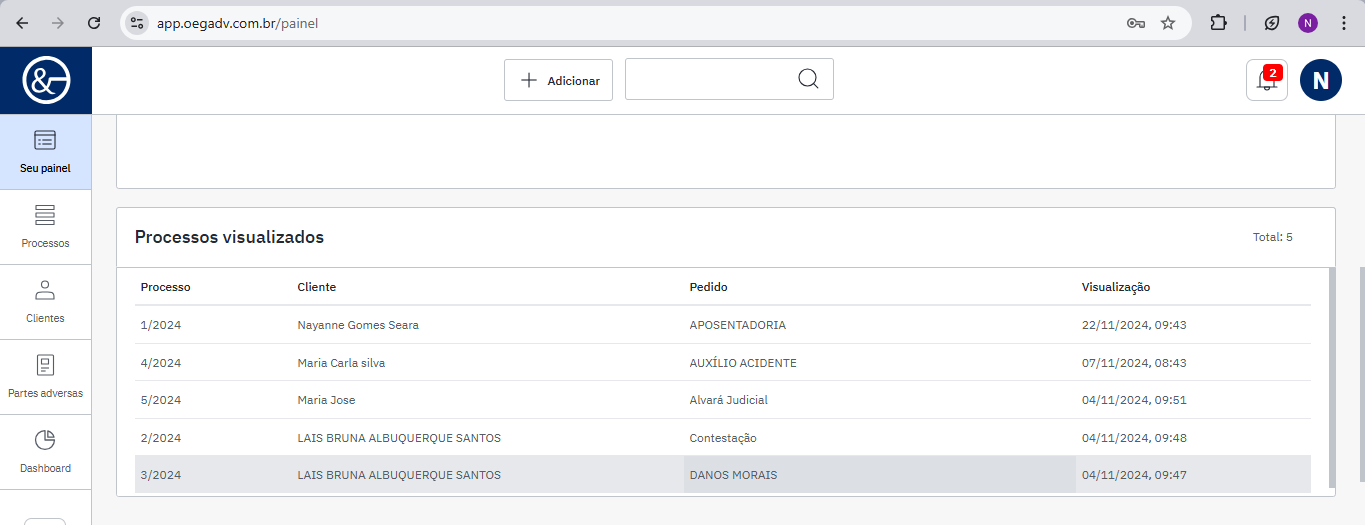 No campo a seguir, são exibidos os detalhes de todos os processos visualizados pela equipe do escritório, incluindo a data e hora em que cada processo foi acessado.