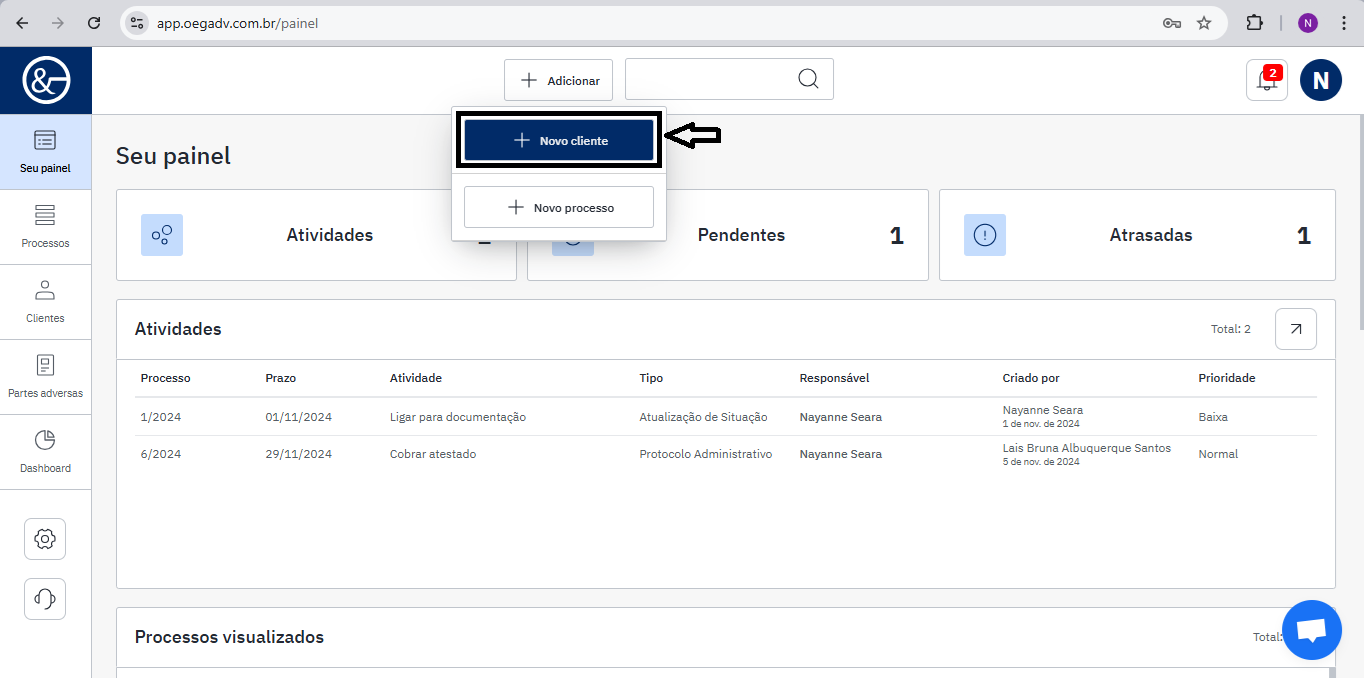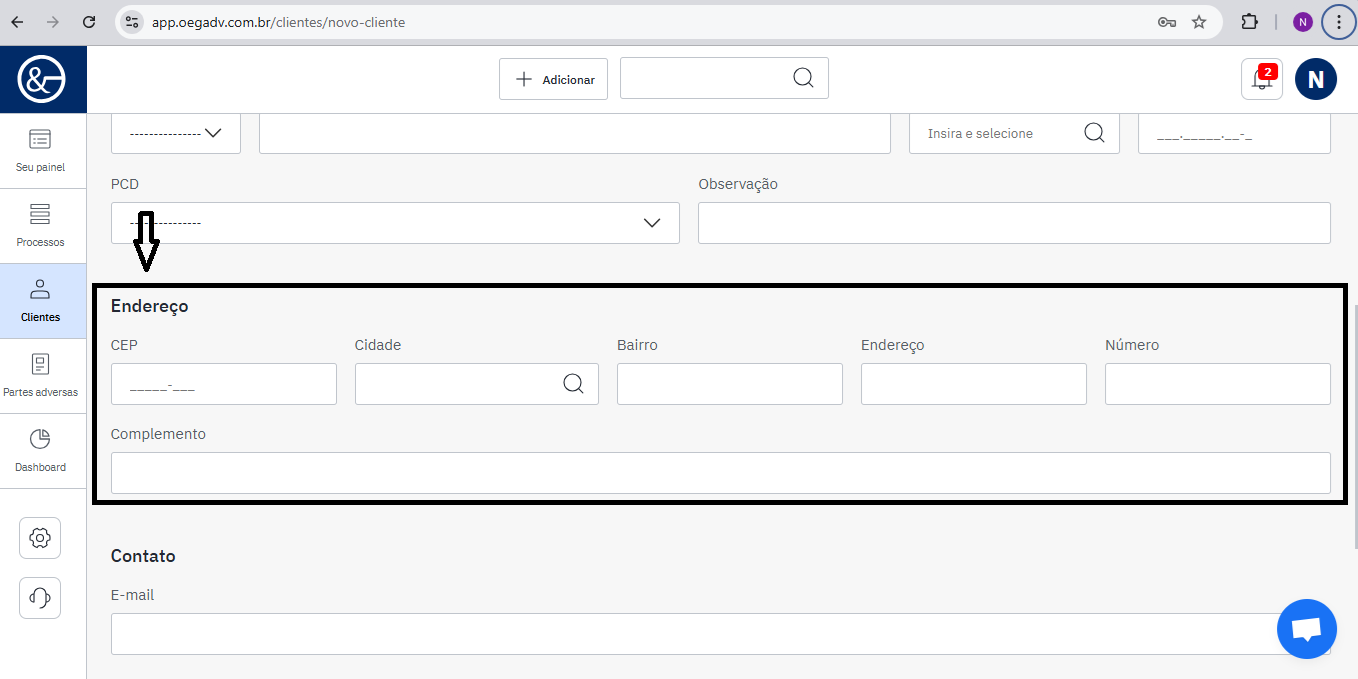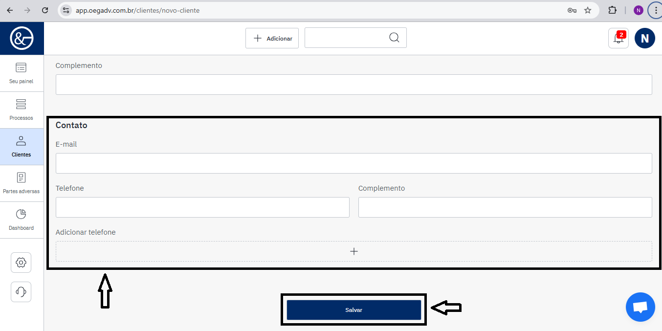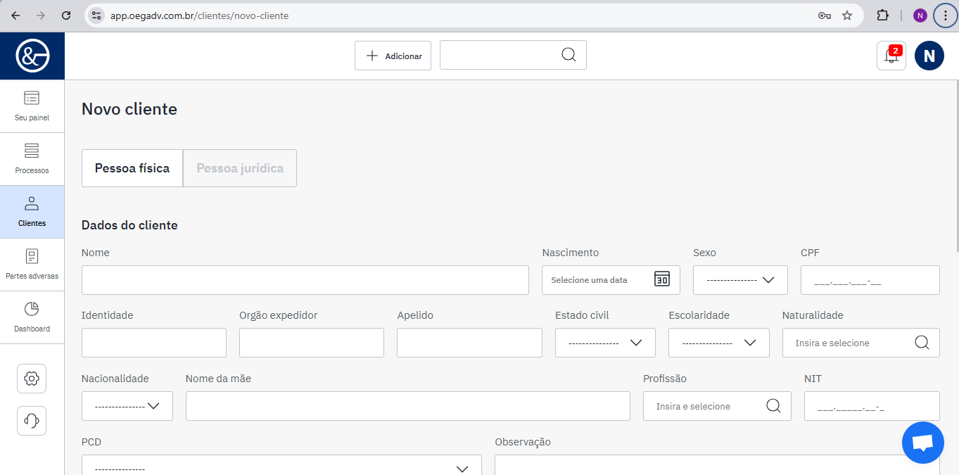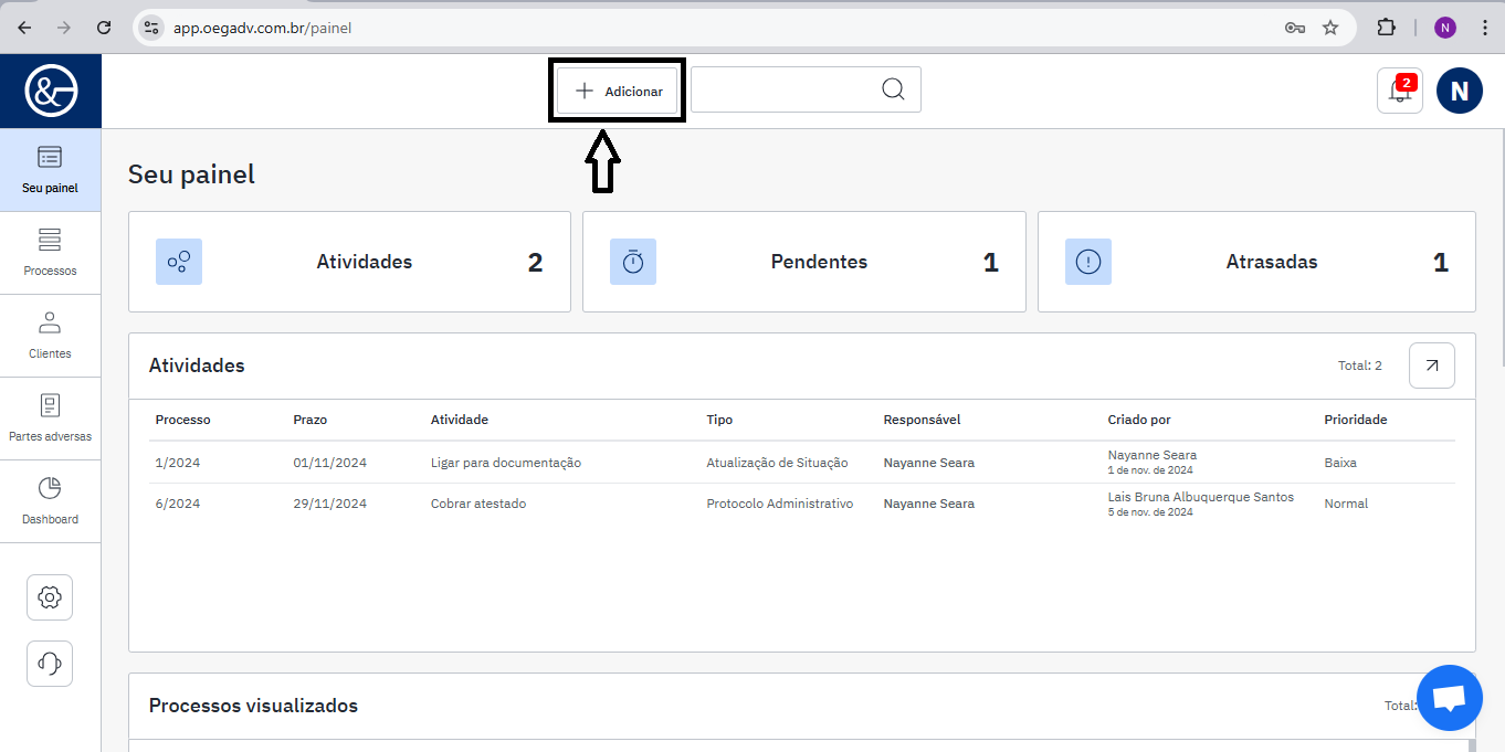 Na tela inicial do OEGadv, no painel principal, clique em "+ Adicionar", localizado no centro superior da página.
